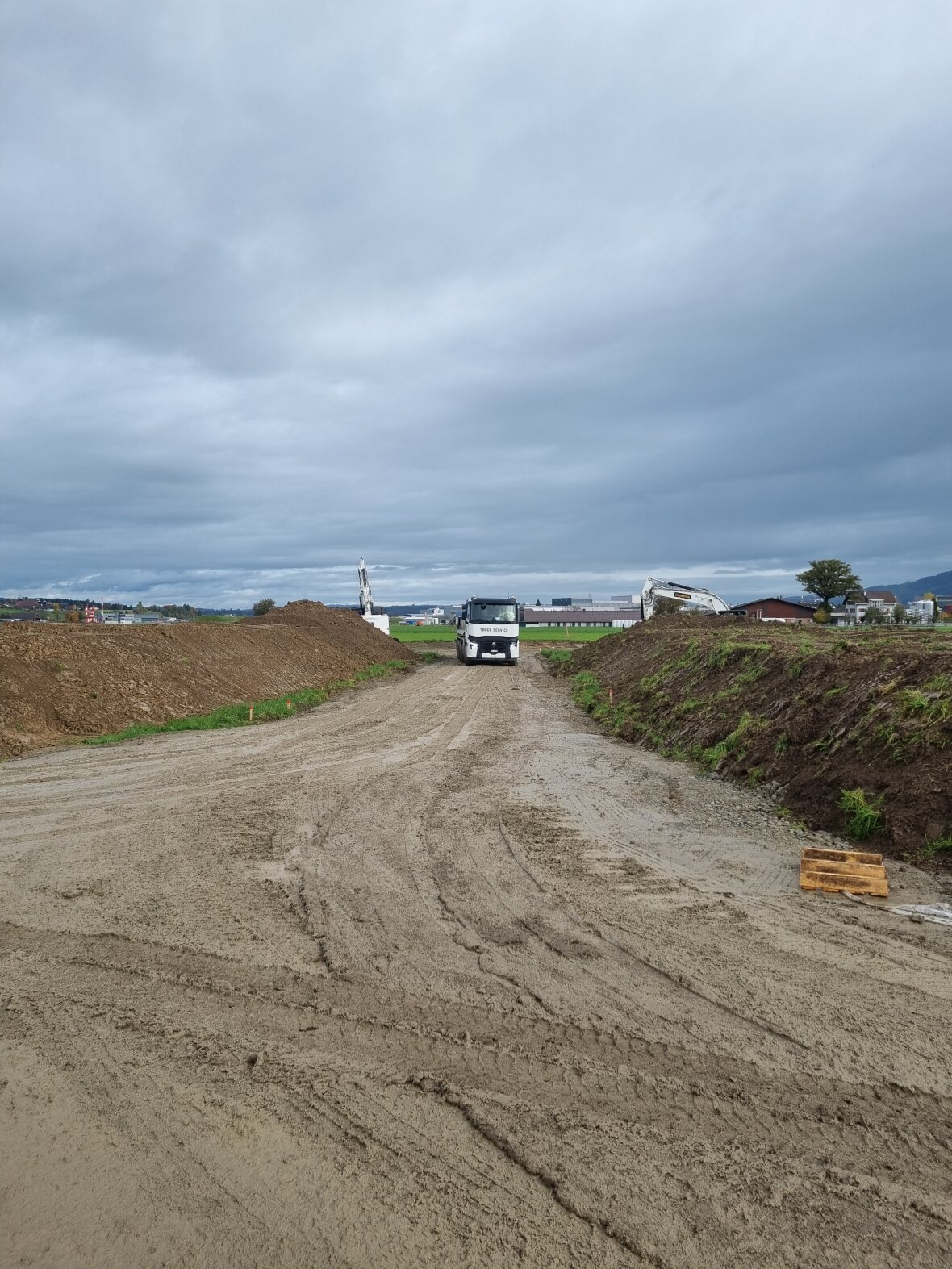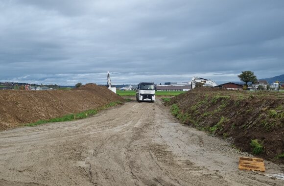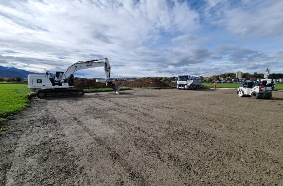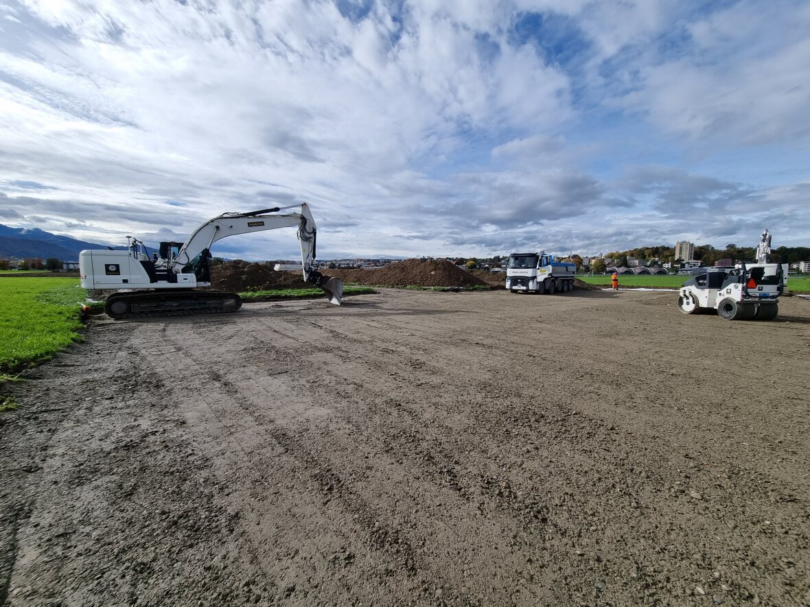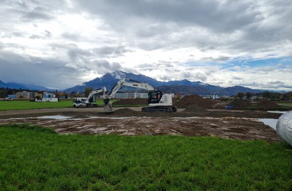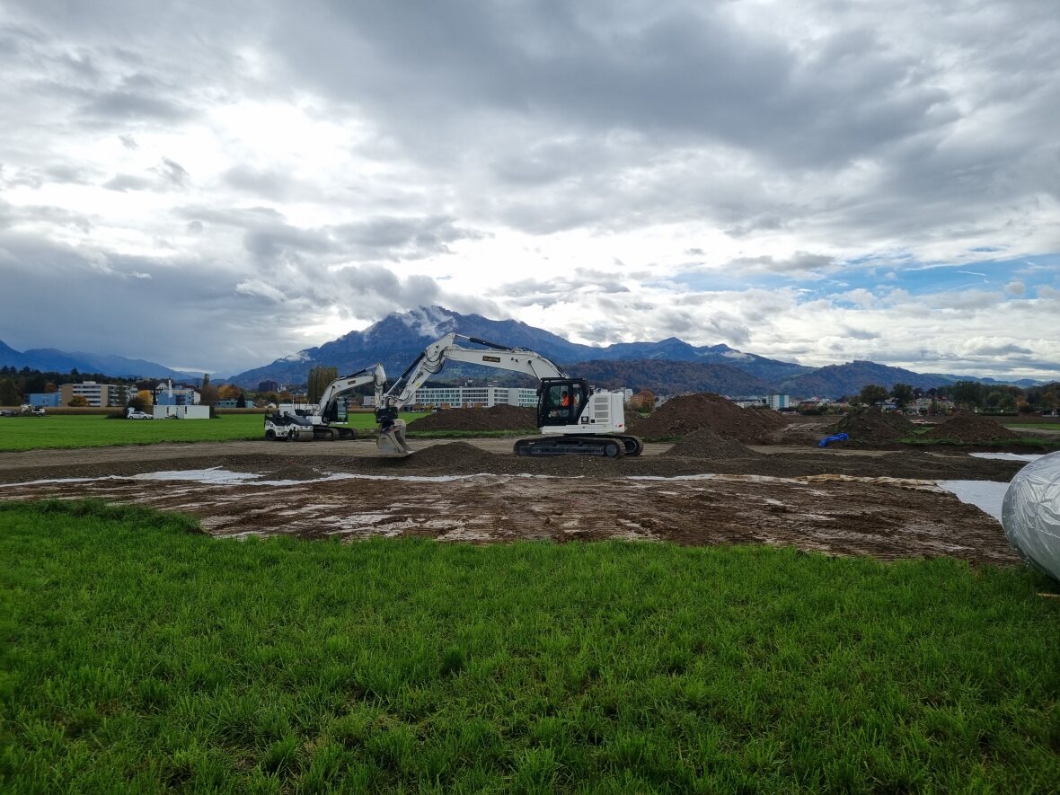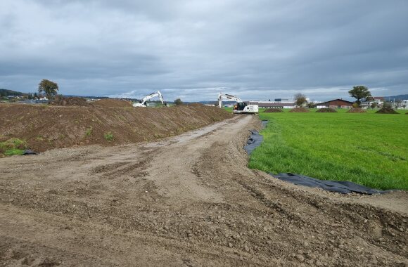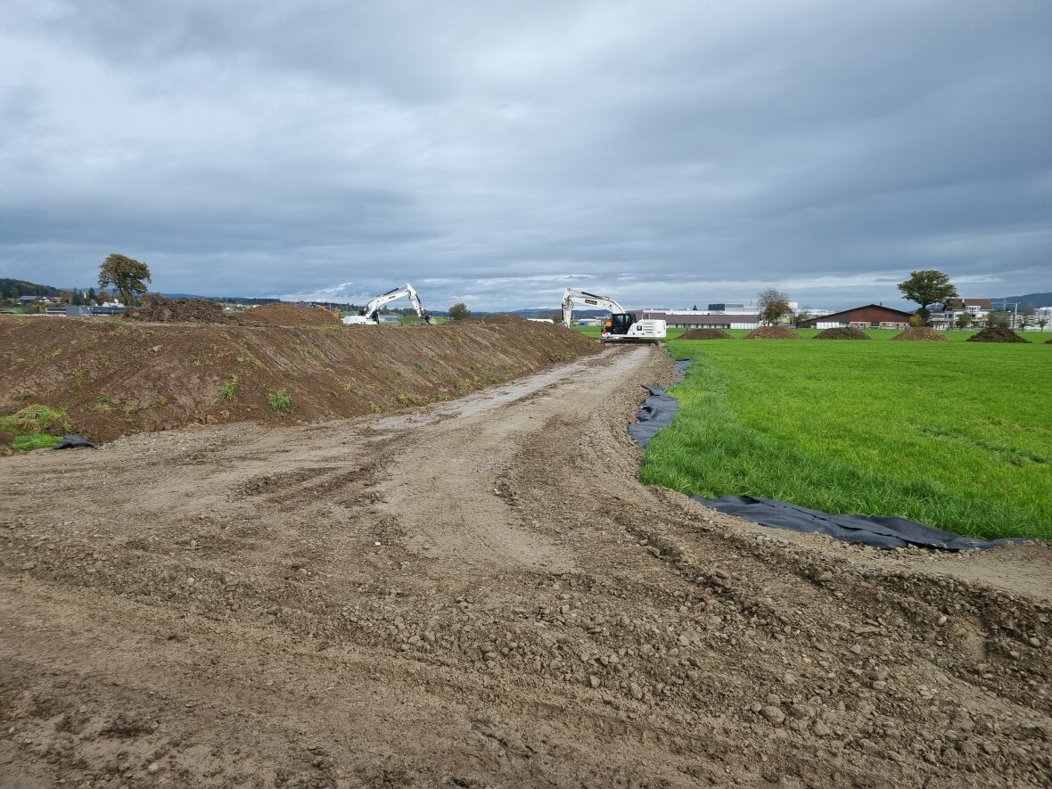 Trotz des eher regnerischen und kühlem Wetter ist der Boden soweit abgetrocknet, dass die Bauarbeiten in Absprache mit der bodenkundlichen Baubegleitung und dem Kanton gestartet werden konnten.