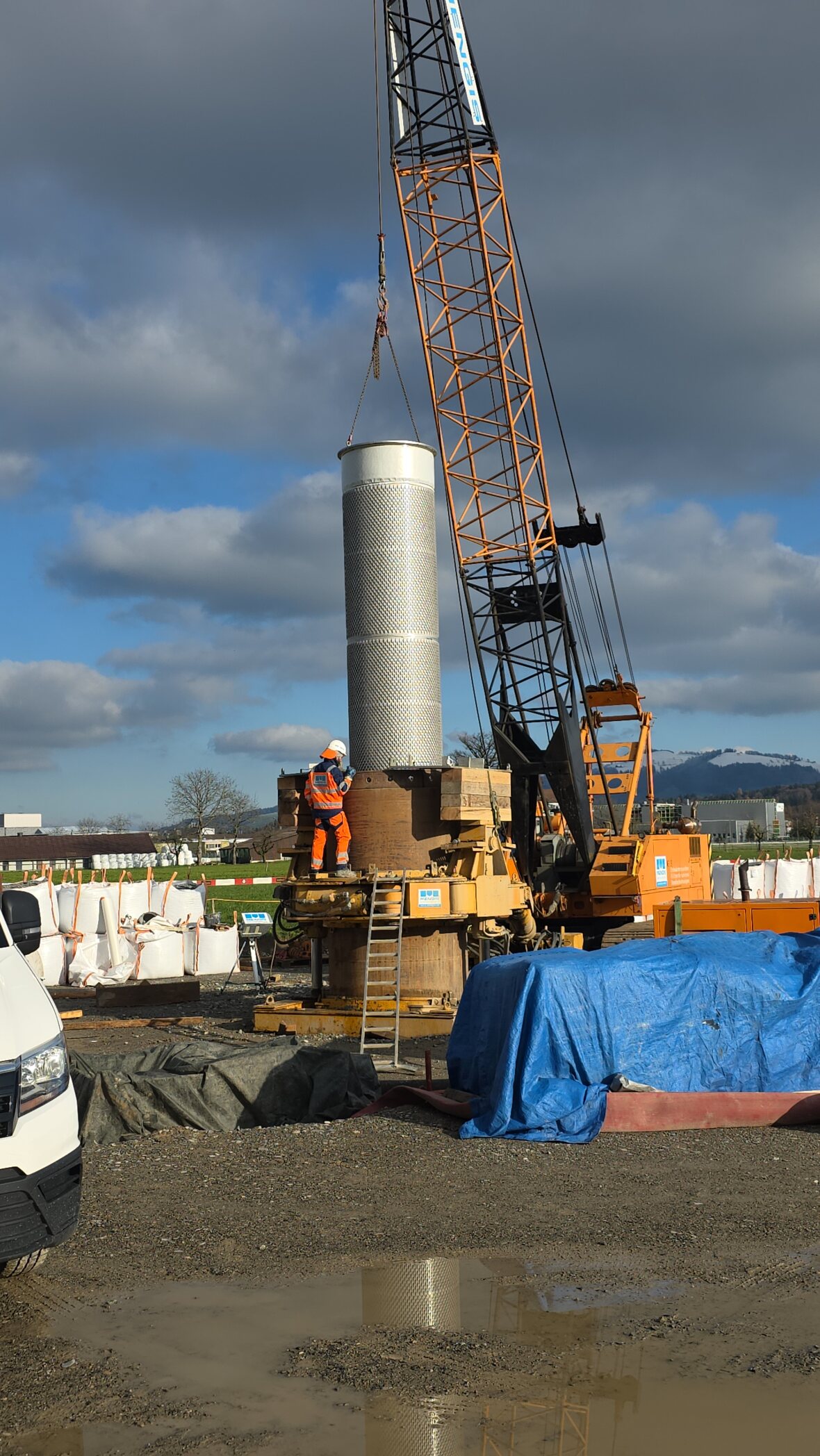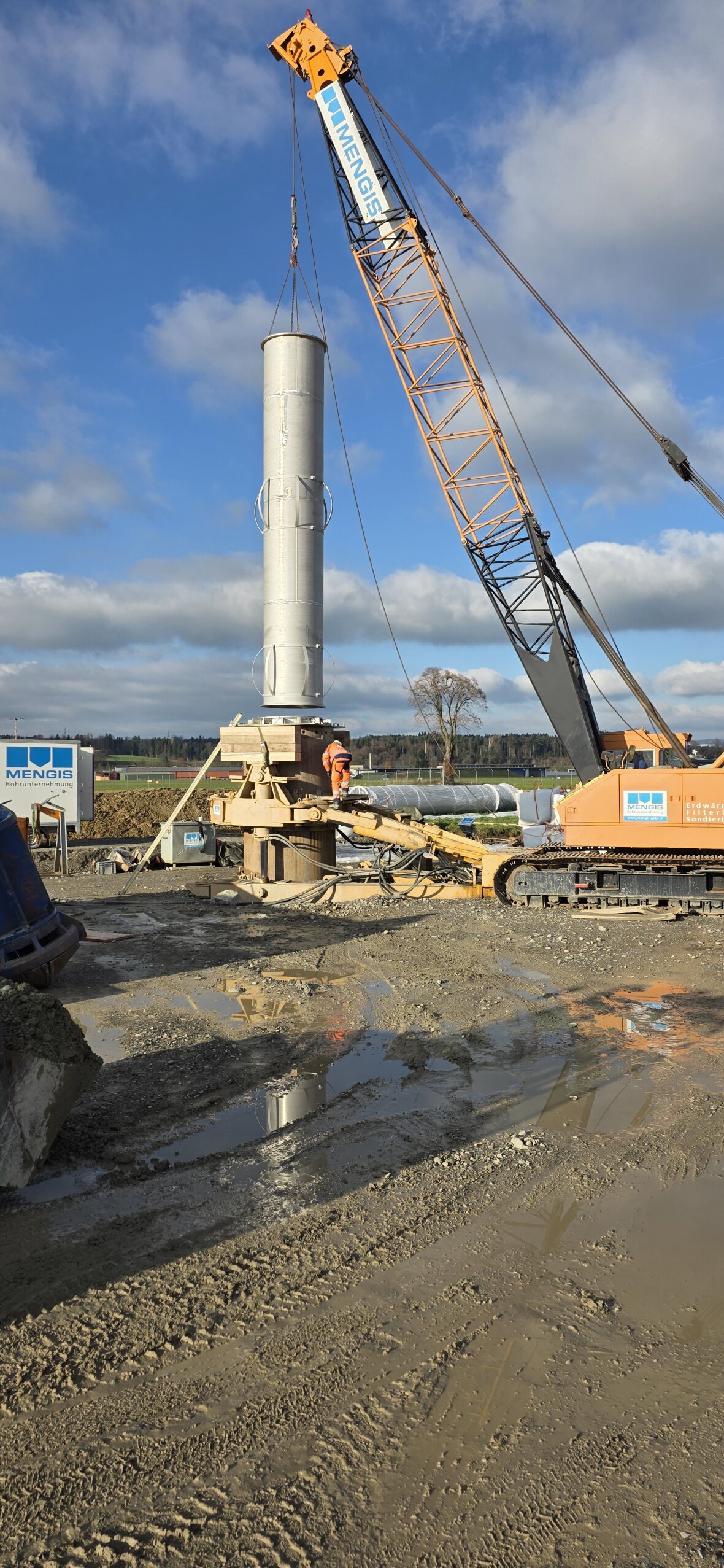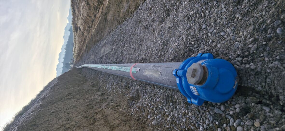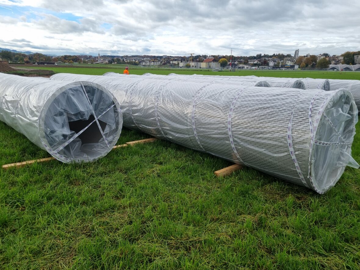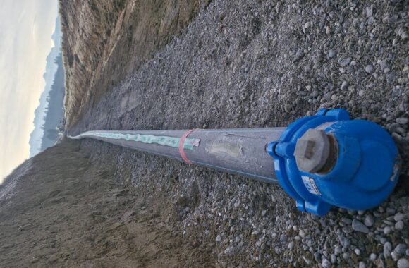 Die grossen Filterrohre aus Chromstahl werden mit dem Bohren in die Erde abgesenkt und bilden dann die eigentliche Wasserfassung.