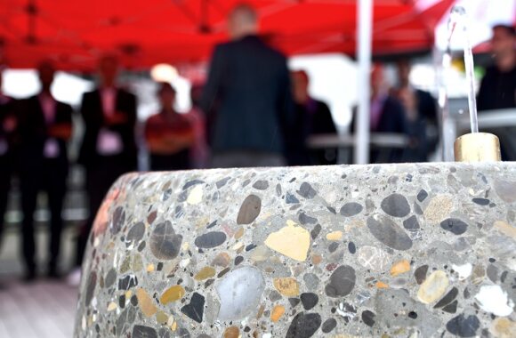 Der Emmer Trinkbrunnen wurde durch den Zürcher Architekten und Produktdesigner Stephan Hürlemann konzipiert. Mit seinem Entwurf wolle er das wertvolle Gut Wasser zelebrieren und das Trinken aus einem öffentlichen Brunnen als angenehmes Ritual gestalten, erläutert der 50-jährige Designer. Ein gewichtiges Augenmerk legte Hürlemann auf die Materialwahl. Der Terrazzo aus bunten Flusskieseln (in Zement beigemischt und geschliffen) würde dem Wasser im Becken optische Frische und Klarheit verleihen. «Mir gefällt die Vorstellung, der Brunnen sei aus einem Flussbett herausgeschliffen worden», sagt Hürlemann.