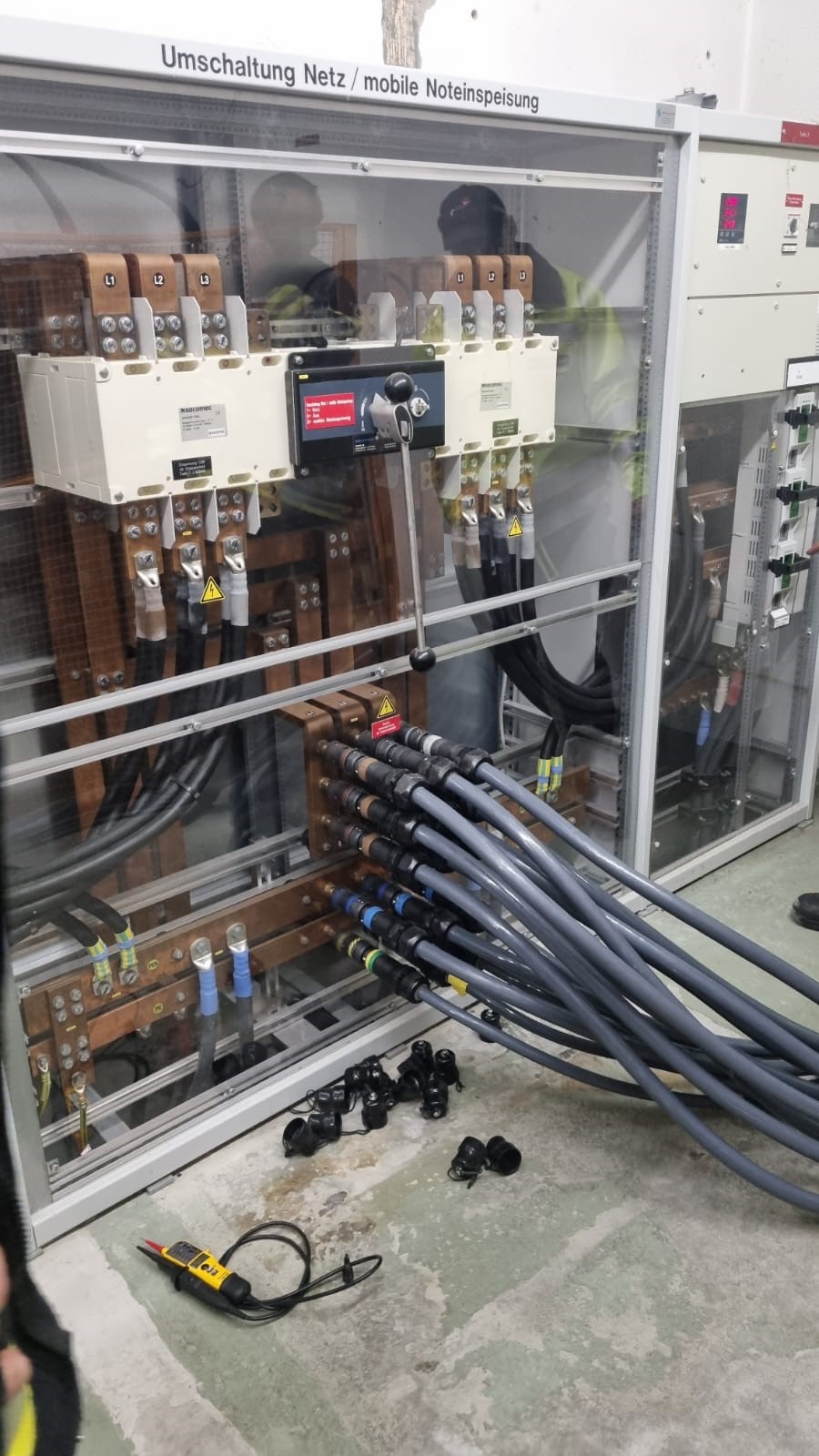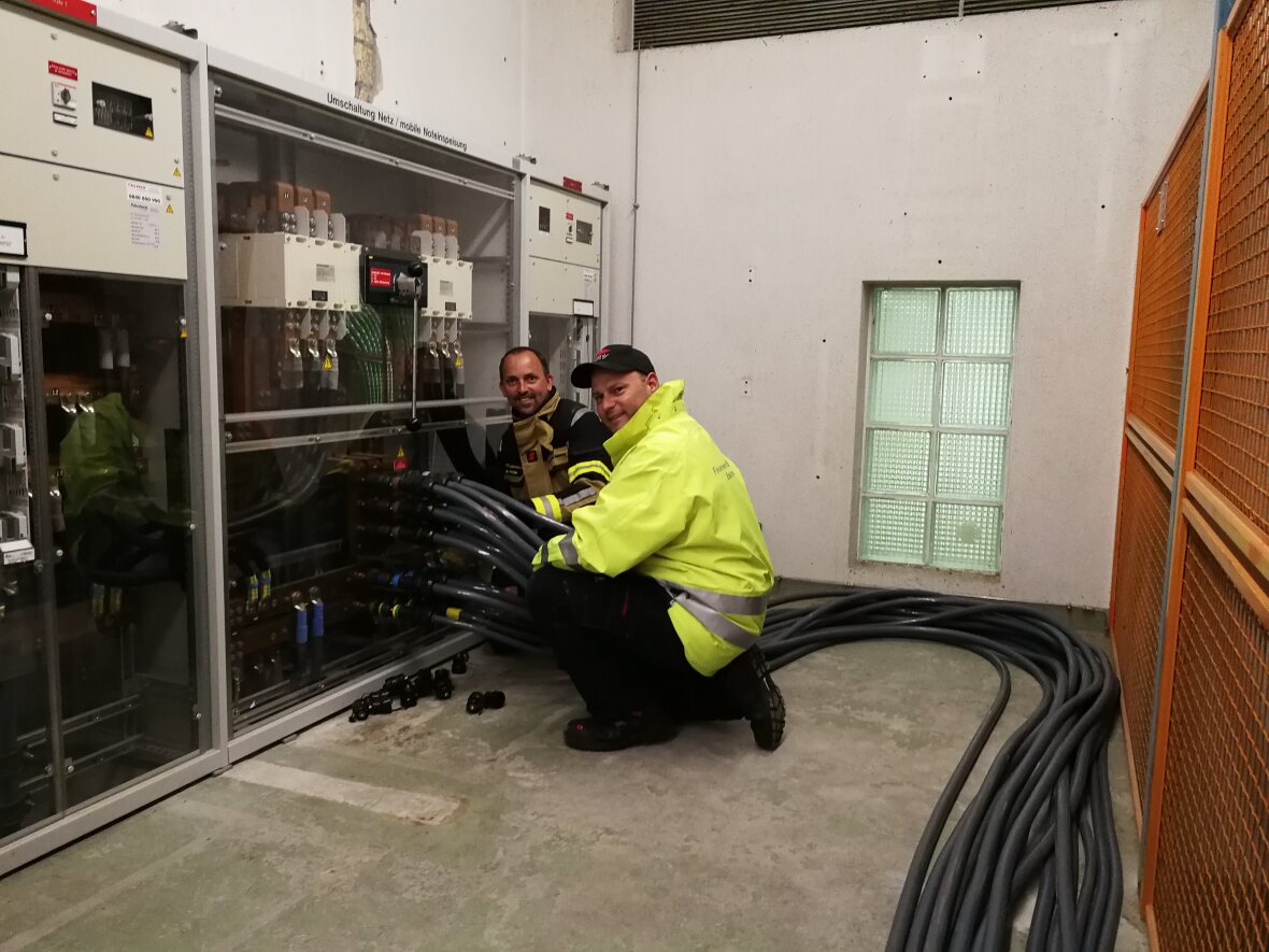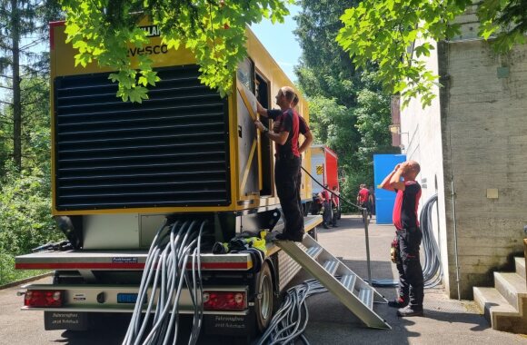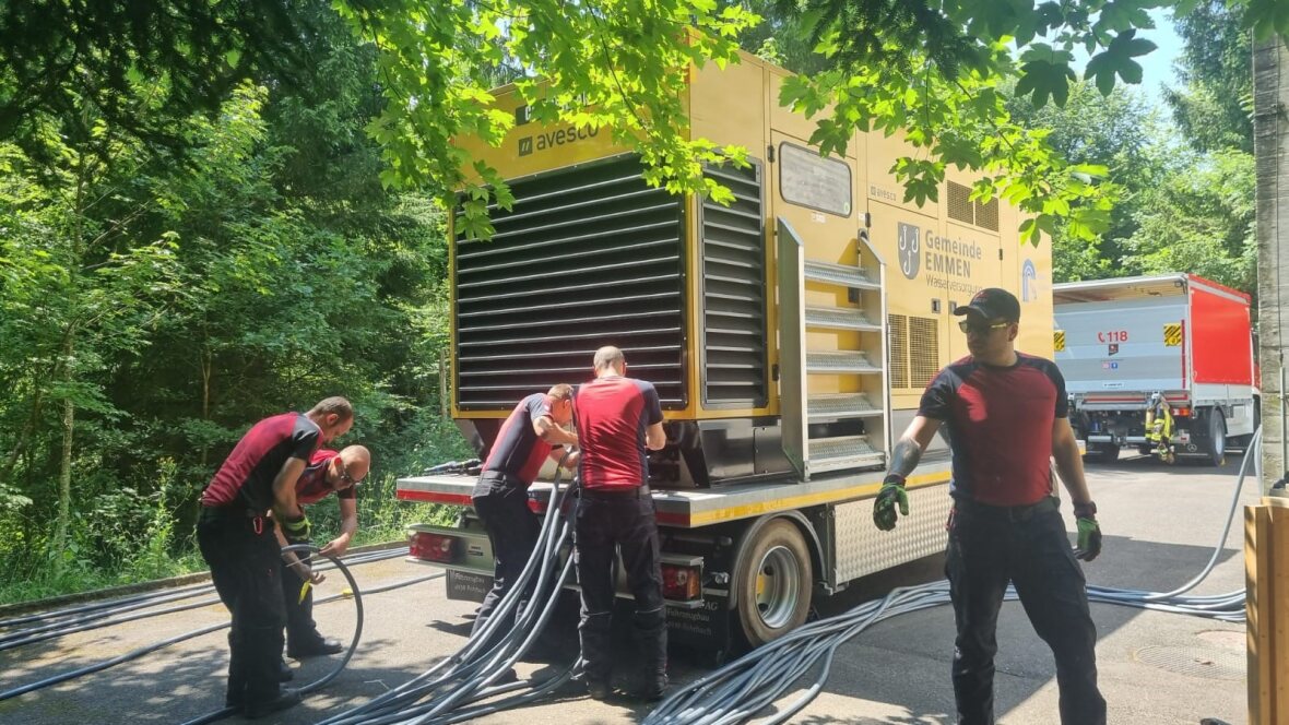 Die schwere Aufgabe des Manövrierens und das Anschliessen der Kabel - ein Kabel wiegt rund 25 Kilogramm - wurde kompetent gemeistert. Nachdem das Grundwasserpumpwerk vom Netzstrom getrennt und auf Notstrom umgeschaltet wurde, wurden die Pumpen sukzessive gestartet. Bis zu vier Pumpen arbeiteten parallel, um die Trinkwasserversorgung sicherzustellen.