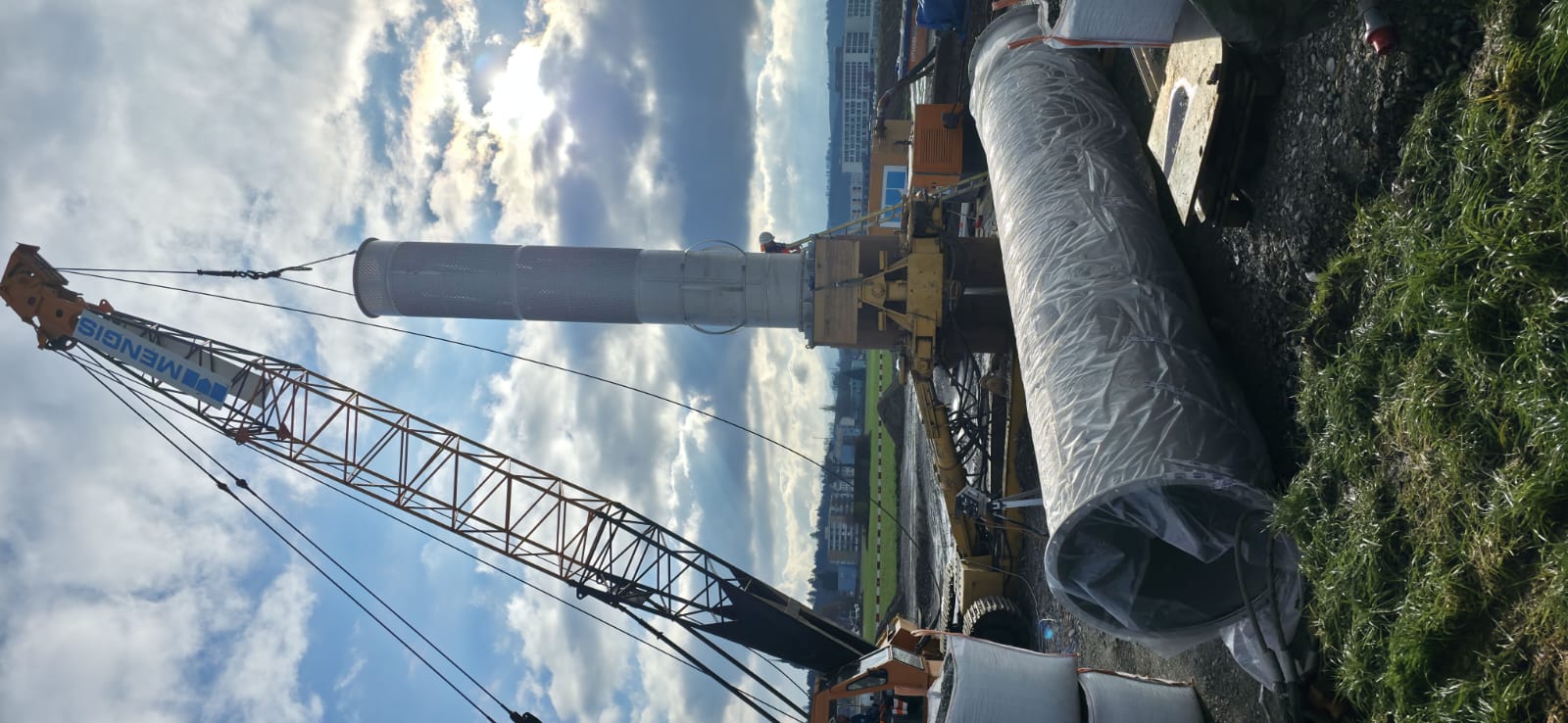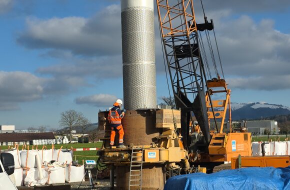 Die grossen Filterrohre aus Chromstahl werden mit dem Bohren in die Erde abgesenkt und bilden dann die eigentliche Wasserfassung.