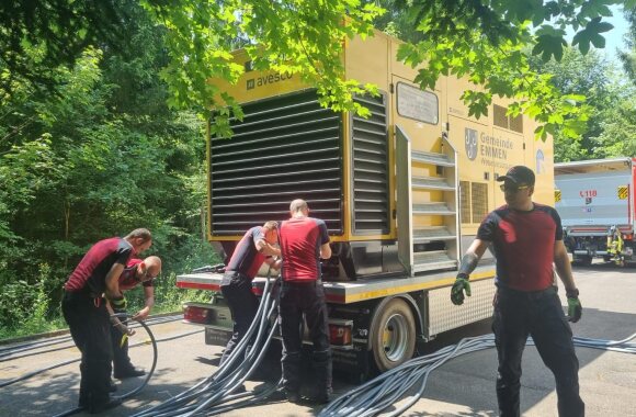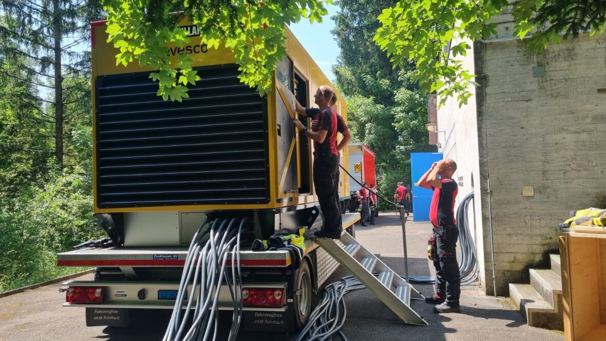 Die schwere Aufgabe des Manövrierens und das Anschliessen der Kabel - ein Kabel wiegt rund 25 Kilogramm - wurde kompetent gemeistert. Nachdem das Grundwasserpumpwerk vom Netzstrom getrennt und auf Notstrom umgeschaltet wurde, wurden die Pumpen sukzessive gestartet. Bis zu vier Pumpen arbeiteten parallel, um die Trinkwasserversorgung sicherzustellen.